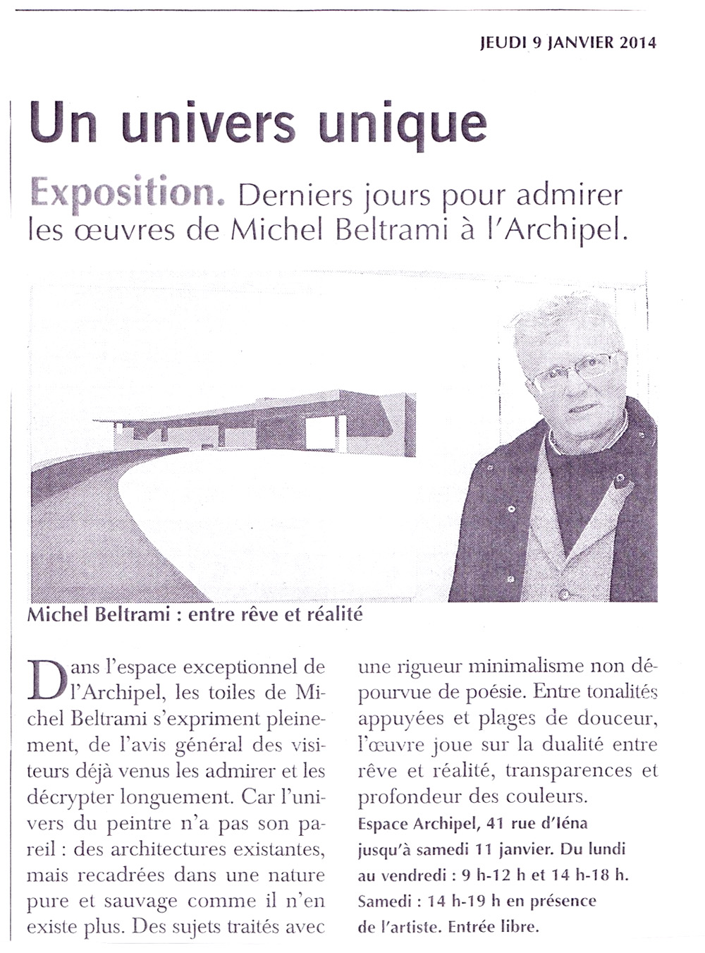 Dans l’espace exceptionnel de l’Archipel, les toiles de Michel Beltrami s’expriment pleinement, de l’avis général des visiteurs déjà venus les admirer et les décrypter longuement. Car l’univers du peintre n’a pas son pareil : des architectures existantes, mais recadrées dans une nature pure et sauvage comme il n’en existe plus. Des sujets traités avec une rigueur minimalisme non dépourvue de poésie. Entre tonalités appuyées et plages de douceur, l’œuvre joue sur la dualité entre rêve et réalité, transparences et profondeur des couleurs.