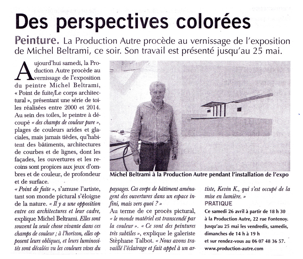 Ce lieu d'exposition au Havre accueille des expositions d'art contemporain. Les vastes espaces de Michel BELTRAMI sont colorés, pastels, presque doux. Ses architectures labyrinthiques, protéiformes, massives sont propices à l'équivoque du trompe l’œil, au jeu, ne sachant si ces ouvertures sont des fermetures, ni si ces miroirs aux reflets courbes, nous épient ou l'inverse. Cette poésie silencieuse, intérieure, agile, d'un corps architectural, nous donne à partager une vision argumentée du monde selon Beltrami. Stéphane Talbot mai 2014.